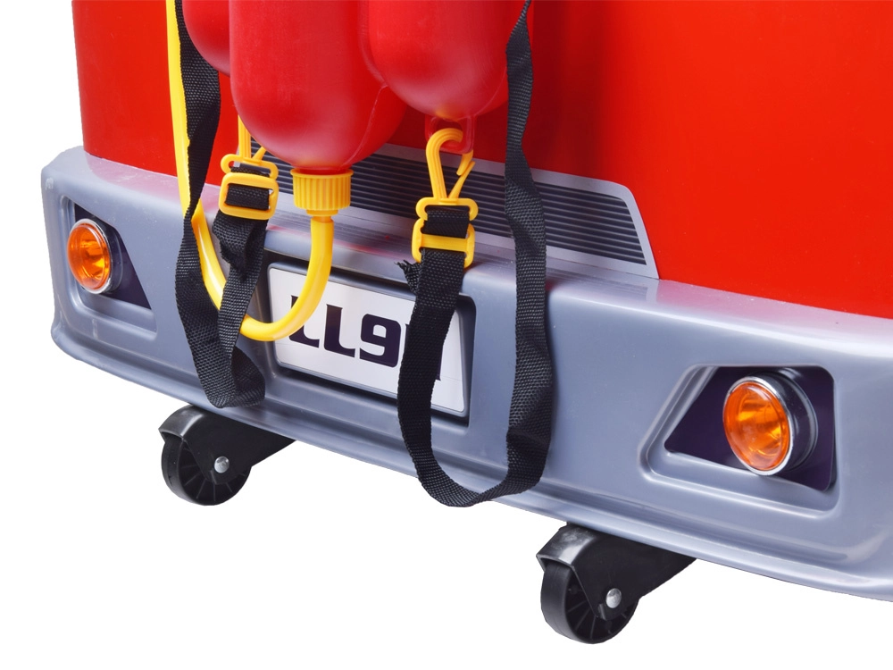 Zadní vodní stříkačka pro akční hašení a otevírací boční schránky na veškeré „zásahové“ vybavení malého hasiče.