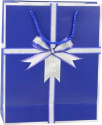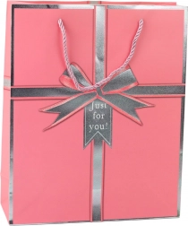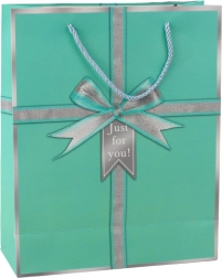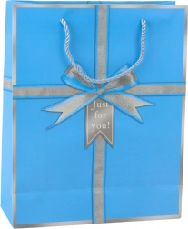 Elegantní dárková taška s motivem stříbrné mašle a nápisem "Just for you!" dodá každému dárku stylový vzhled. Je vyrobena z kvalitního ozdobného kartonu, má pevné šnůrkové uši a univerzní rozměr 32 × 26 × 12 cm pro menší i středně velké dárky. Dostupná ve 4 elegantních barvách – modrá, zelená, růžová a světle modrá.