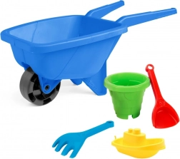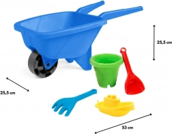 Součástí je modré kolečko (délka 53 cm) a 4dílný pískový set: vědro 1 l ve tvaru hradu, loďka, lopatka a hrábky. Kolečko skvěle poslouží k převážení písku, listí, drobných kamínků i hraček. Celá sada je vyrobena z kvalitního, odolného a bezpečného plastu, který snese různé povětrnostní podmínky.