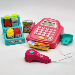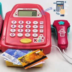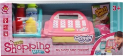 Součástí je i police s artikly, bankovky, mince, platební karta a krabička „sušenek“, takže si děti mohou vytvořit vlastní mini obchod. Hra rozvíjí komunikaci, jemnou motoriku, kreativitu a představivost.