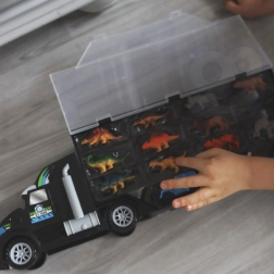 Objevte multifunkční náklaďák, který je zároveň praktickým kufříkem a zábavnou vystřelovací stanicí. Dvoustanná korba s průhledným víkem pojme celkem 24 figurek či autíček, takže má každé své místo a nic se neztratí. Set zahrnuje 6 dinosaurů, 6 zvířátek, malé autíčko a vrtulník – vše připravené k okamžité hře.