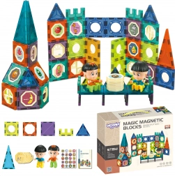Set obsahuje různorodé tvary pro stavbu věží, domků a zámků, 2 figurky pro příběhovou hru, samolepky pro dotvoření detailů a návod s inspiracemi. Praktické balení s uchem se snadno přenáší a je skvělým dárkem.