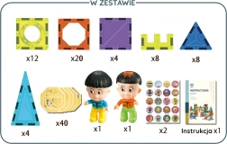 - Různé magnetické dílky, 2 figurky, samolepky, návod