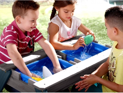 Oddělené nádoby podporují smyslovou hru – na jedné straně písek, na druhé voda. Vaničky lze vyjmout a rychle vyčistit.