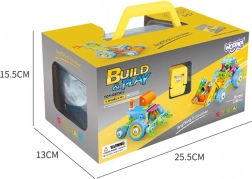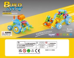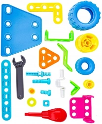- 118 dílů: různotvaré stavební prvky, kola, šrouby a matice, šroubovák a plochý klíč