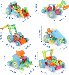 - 6 modelů v jednom: nakladač, auto, bagr, traktor s pluhem, traktor bez střechy, jeřáb
