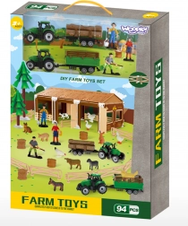 Kompletní set zahrnuje zvířátka, trojici postaviček, dvojici traktorů s odpojitelnými přívěsy, stodolu, ohrady a mnoho doplňků – vše pro stavbu vlastní farmy.