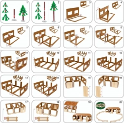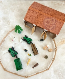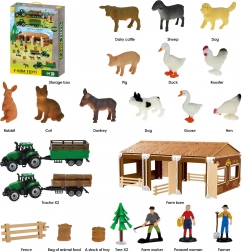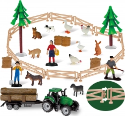 - 12 figurek zvířat, 3 figurky lidí, 2 traktory s odpojitelnými přívěsy, stodola/zagroda, ohrady a další farmářské doplňky