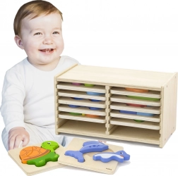 Úkolem dítěte je správně umístit barevné kousky puzzle na příslušnou desku. Jednoduché tvary, krásné obrázky a přitažlivé barvy upoutají pozornost dětí a pomohou jim rozvíjet dovednosti skládání. Součástí sady je i dřevěný stojan na uložení desek.