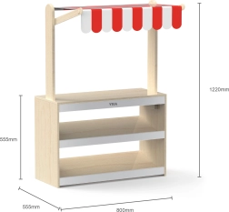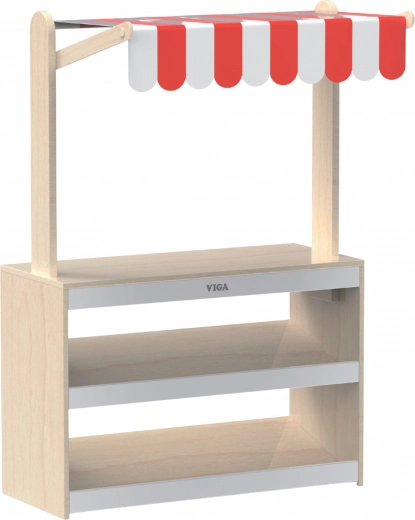 Dřevěný stánek VIGA je ideální volbou pro děti, které milují hru na obchod. Díky robustní dřevěné konstrukci a ikonické červeno‑bílé stříšce působí jako opravdové tržištní stanoviště. Dvě praktické police umožní přehledně vystavit „zboží“ a podpoří přirozenou interakci během hry.