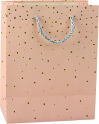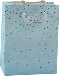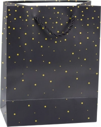 Tato papírová dárková taška se zlatými puntíky je nadčasovým doplňkem pro elegantní zabalení dárků. Odolný dekorativní karton si drží tvar a vypadá reprezentativně i při opakovaném použití, zatímco pevná šňůrková držadla zajišťují pohodlné a bezpečné přenášení.