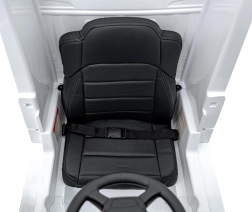 Integrovaný audio panel s přehráváním z MP3, Bluetooth a USB doplní jízdu oblíbenou hudbou. Ergonomické sedadlo z eko kůže s bezpečnostními pásy a měkká EVA kola 23×8 cm zajišťují komfort v interiéru i exteriéru.