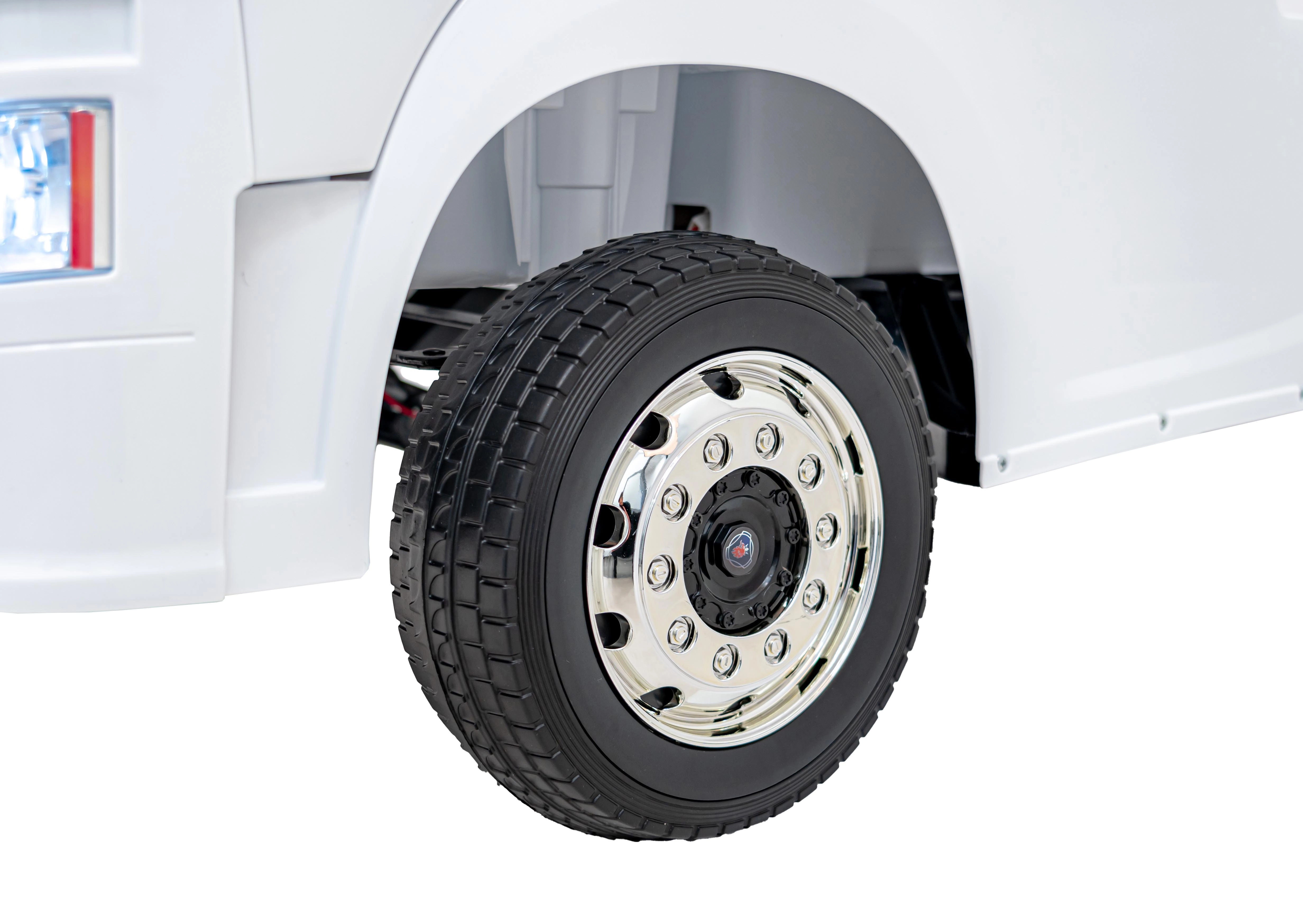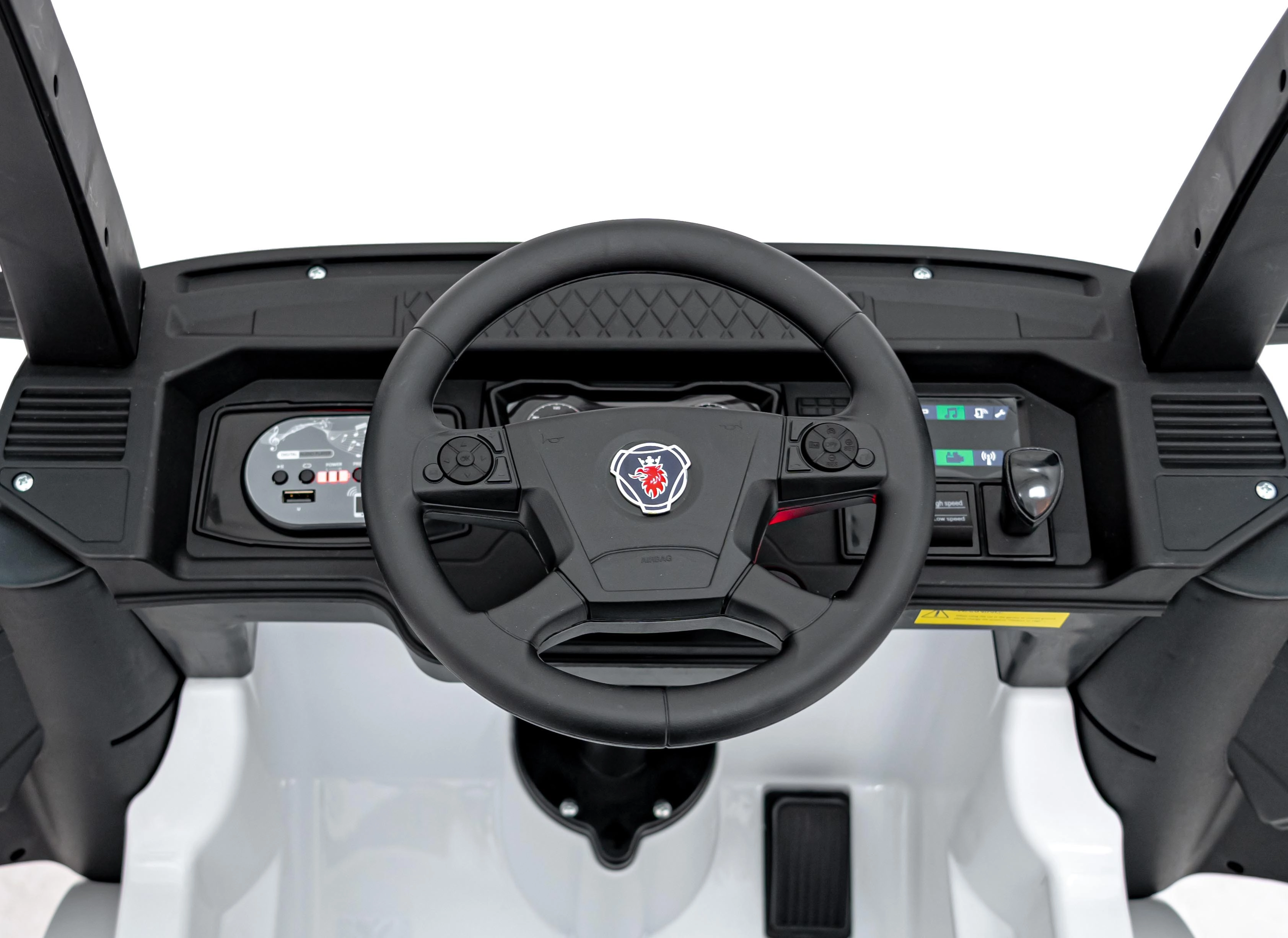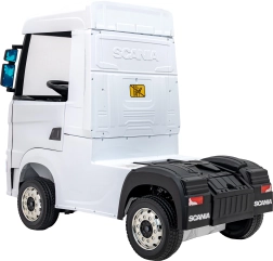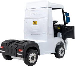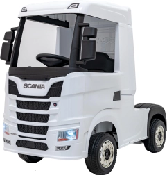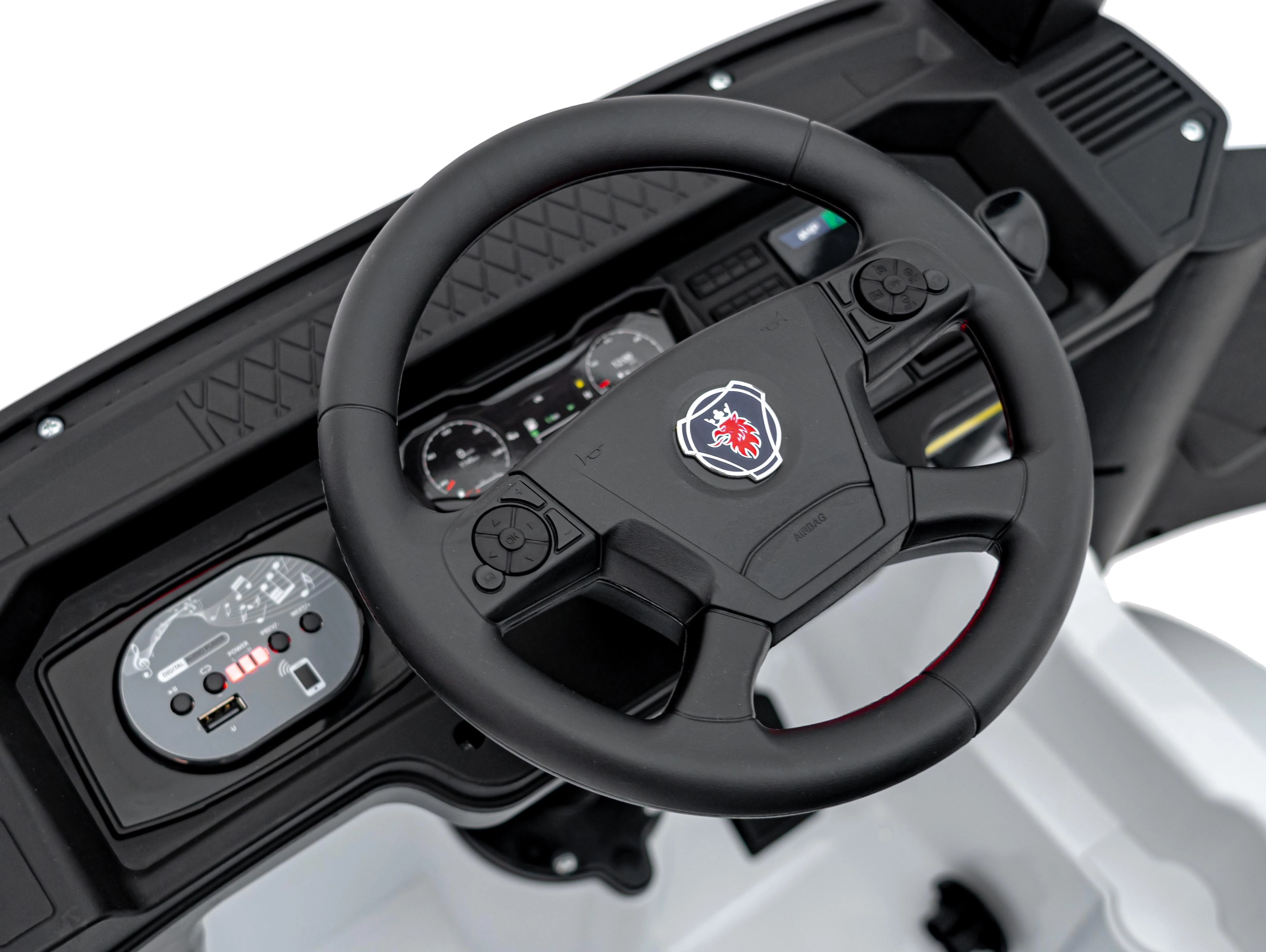 Realistický dětský kamion SCANIA R‑SERIES v elegantní bílé barvě přináší dětem autentický zážitek z řízení. Výkonný pohon 4x35 W, dvojitý akumulátor 2x12 V 7 Ah a komfortní sedadlo z eko kůže s bezpečnostními pásy zajistí pohodlnou a bezpečnou jízdu. Rodičovský dálkový ovladač 2,4 GHz s funkcí Stop, LED světla a multimediální panel s Bluetooth/MP3/USB se postarají o zábavu i kontrolu.