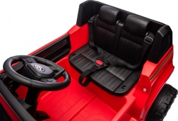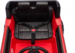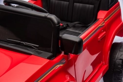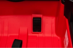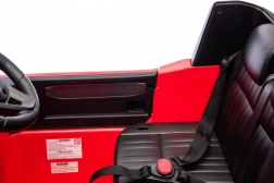 Interiér potěší pohodlným sedadlem z ekokůže s pásy, funkčním audio panelem (Bluetooth, USB, MP3), předními LED světly a ovládacími prvky na volantu (klakson, zvuky). O bezpečí se stará dálkové ovládání 2,4 GHz se třemi rychlostmi a nouzovým zastavením.