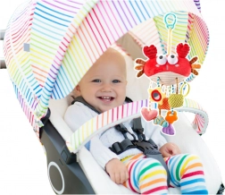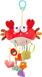 Krab obsahuje 9 funkcí v 1 produktu, jako je chrastítko, kousátko, pískátko, šustící nožičky, zrcátko se zrcadlícím efektem a další. Hračku lze snadno připevnit univerzálním klipem na kočárek, postýlku, autosedačku či lehátko.