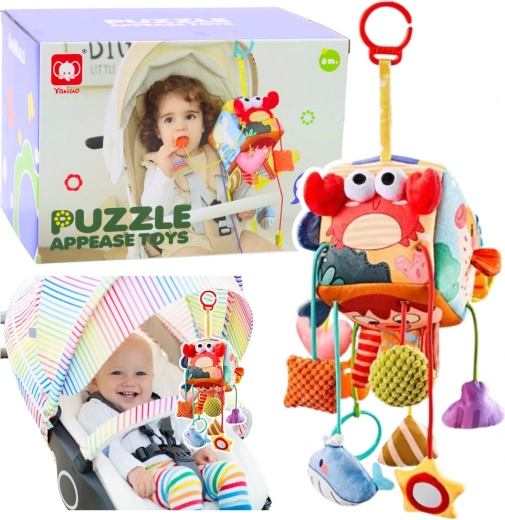 Závěsky připevněné na kostce mají různé funkce. Některé šustí nebo cinkají, zatímco jiné lze natahovat a mačkat. Všechny části hračky podporují dítě v interakci a samostatném objevování.