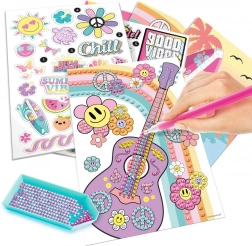 - 2 archy samolepek, více než 2500 ks barevných kamínků, aplikátor/pero, tácek, vosk, organizér na kamínky