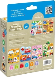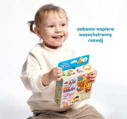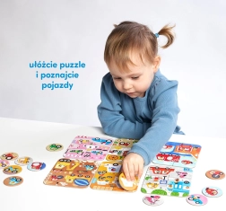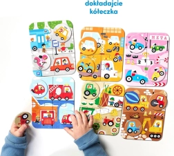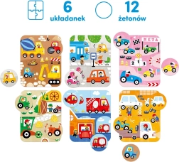 V balení najdete šest barevně odlišených čtyřdílných puzzle s oblíbenými vozidly – od hasičského vozu a závodního auta po traktor a odtahovku. Po složení se z puzzlí stanou herní plánky, ke kterým děti přiřazují 12 tematických žetonů. To podporuje učení nových slov, rozvoj vizuálního vnímání a logického myšlení.