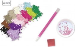 - Lepicí plátno s ochrannou fólií, cca 1350 kamínků ve 14 barvách, guma, aplikační pero, návod v brožuře
