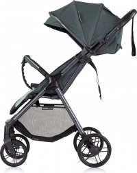 O plynulou jízdu se starají odpružená a rychle odnímatelná kola se zadní článkovou brzdou, zatímco dítěti zajistí komfort polstrované 5bodové pásy, nastavitelná opěrka zad i nohou a velká stříška s větracím průhledem, sluneční clonou a kapsou na drobnosti. Praktický velký koš pojme nákupy i vše potřebné na cestu.