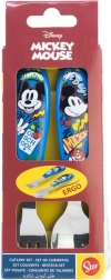 Nerezová sada dětských příborů s motivem Mickey Mouse, která zahrnuje vidličku a lžíci pro zábavné a bezpečné stolování.