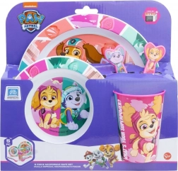 Roztomilá a praktická dětská jídelní sada 5v1 s motivem PAW PATROLbarevnému potisku. Obsahuje talířek, misku, lžičku, vidličku a kelímek. Sada je bez BPA a kelímek je vhodný do mikrovlnky (600 W / 2 min).
