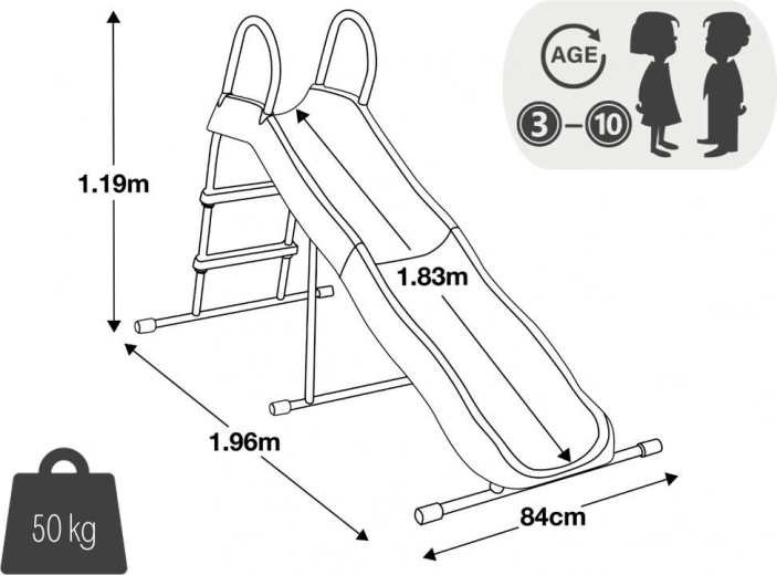 Se šířkou 84 cm, hloubkou 196 cm a výškou 119 cm se snadno vejde do většiny zahrad. Délka skluzu 183 cm je ideální pro menší i starší děti v doporučeném věku 3–10 let. Díky stabilní konstrukci a kvalitním materiálům je to skvělá volba pro každodenní venkovní hraní.