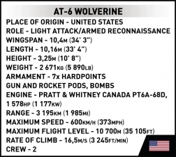 AT‑6 WOLVERINE je moderní pokračovatel legendárního cvičného letounu T‑6 Texan. Stavebnice od COBI věrně zachycuje jeho tvary, zbarvení a detaily, včetně otevíracího překrytu kabiny, podvěšené výzbroje a typického vrtulového pohonu. Díky přehlednému návodu je stavba intuitivní a zábavná, a hotový model vypadá skvěle jak na poličce, tak při akční hře.