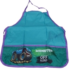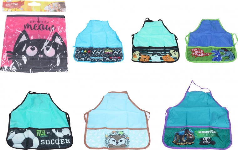 Děti si mohou vybrat z pestrého výběru designů: fotbal, kočka, gamer, monster truck, dino, ježek nebo pes + kočka. Zástěra se hodí do školy, kroužků i na domácí malování.