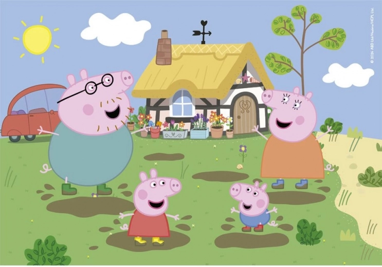 - Oblíbený motiv Peppa Pig – atraktivní obrázek „Zábava v blátě“ motivuje k opakovanému skládání.