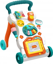 Díky odnímatelným doplňkům jako je mini piánko, hračkový telefon a magnetická mazací tabulka si dítě může hrát vsedě i v pohybu. Protiskluzová kolečka zajišťují stabilitu, zatímco pestré motivy a obrázková knížka podporují zrakovou stimulaci a zvědavost.