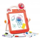 Kreslicí strana nabízí čistou, suchostíratelnou plochu, 8 barevných fixů, houbičku a 18 oboustranných karet pro opakované malování a psaní.