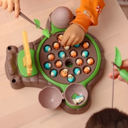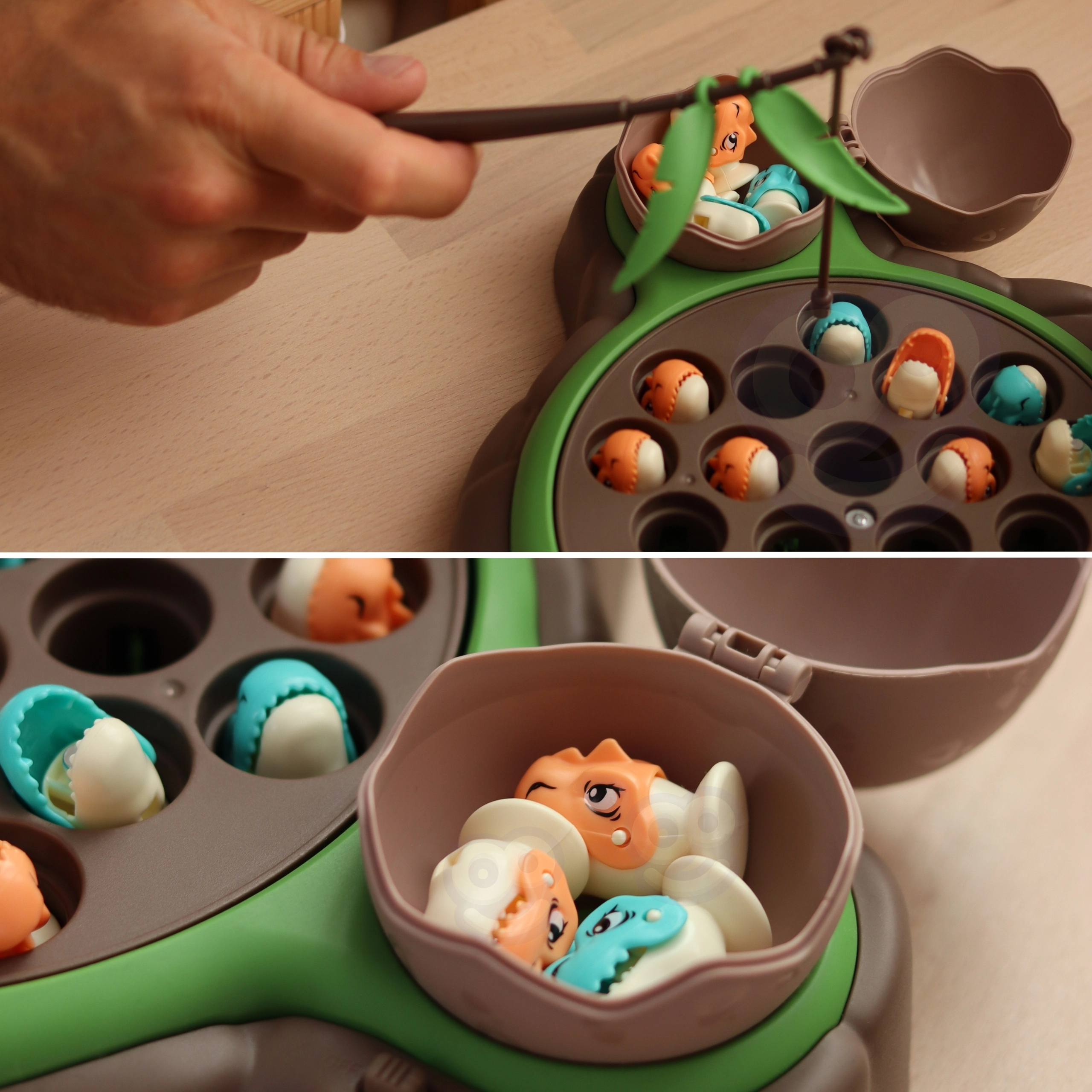 Vydejte se na předhistorický rybolov s hrou, která děti okamžitě vtáhne do děje. Kulatá točna se otáčí a dinosauří tlamičky se rytmicky otevírají a zavírají – úkolem je v pravý moment chytit je magnetickým prutem. Hra podporuje trpělivost, postřeh i spolupráci mezi dětmi a dospělými.