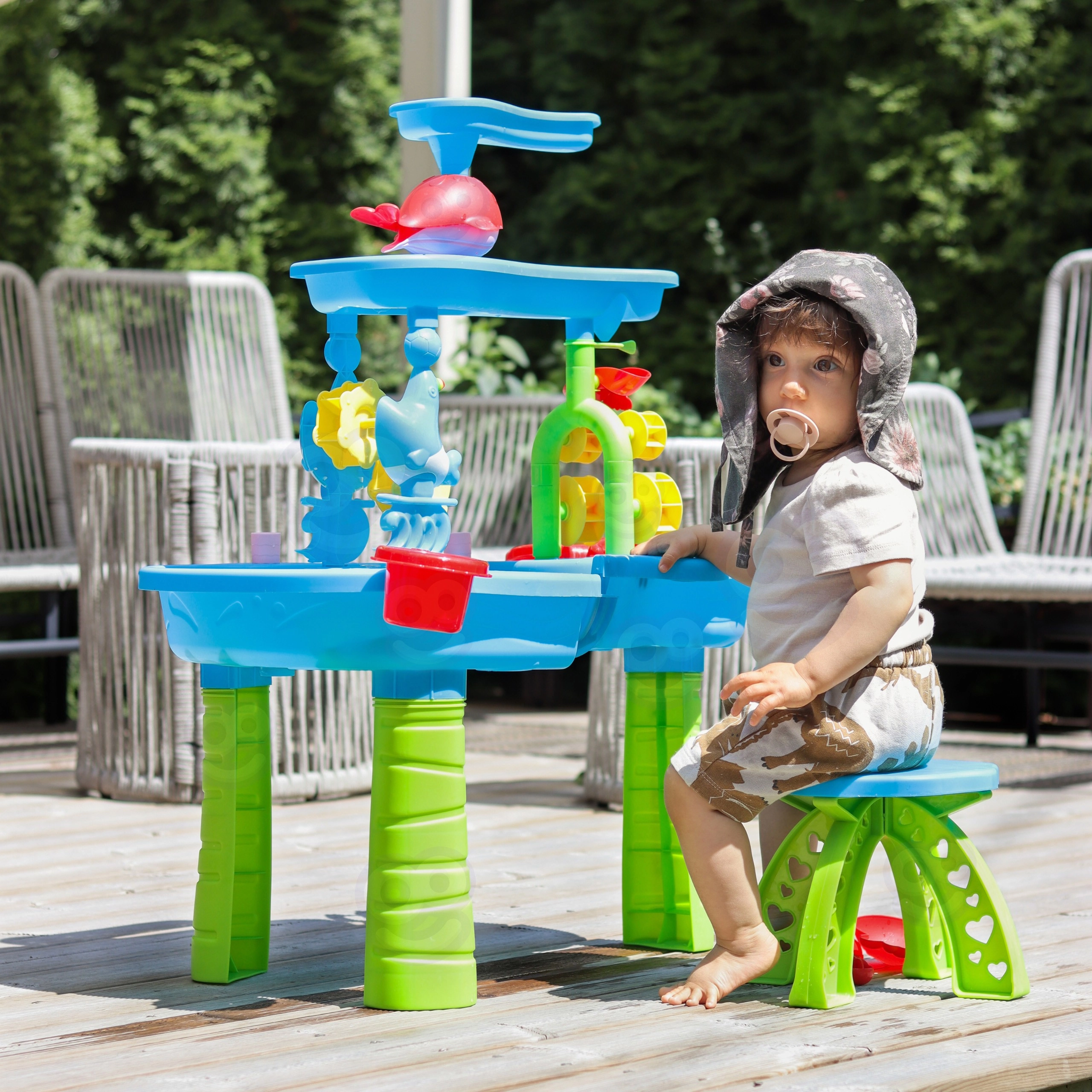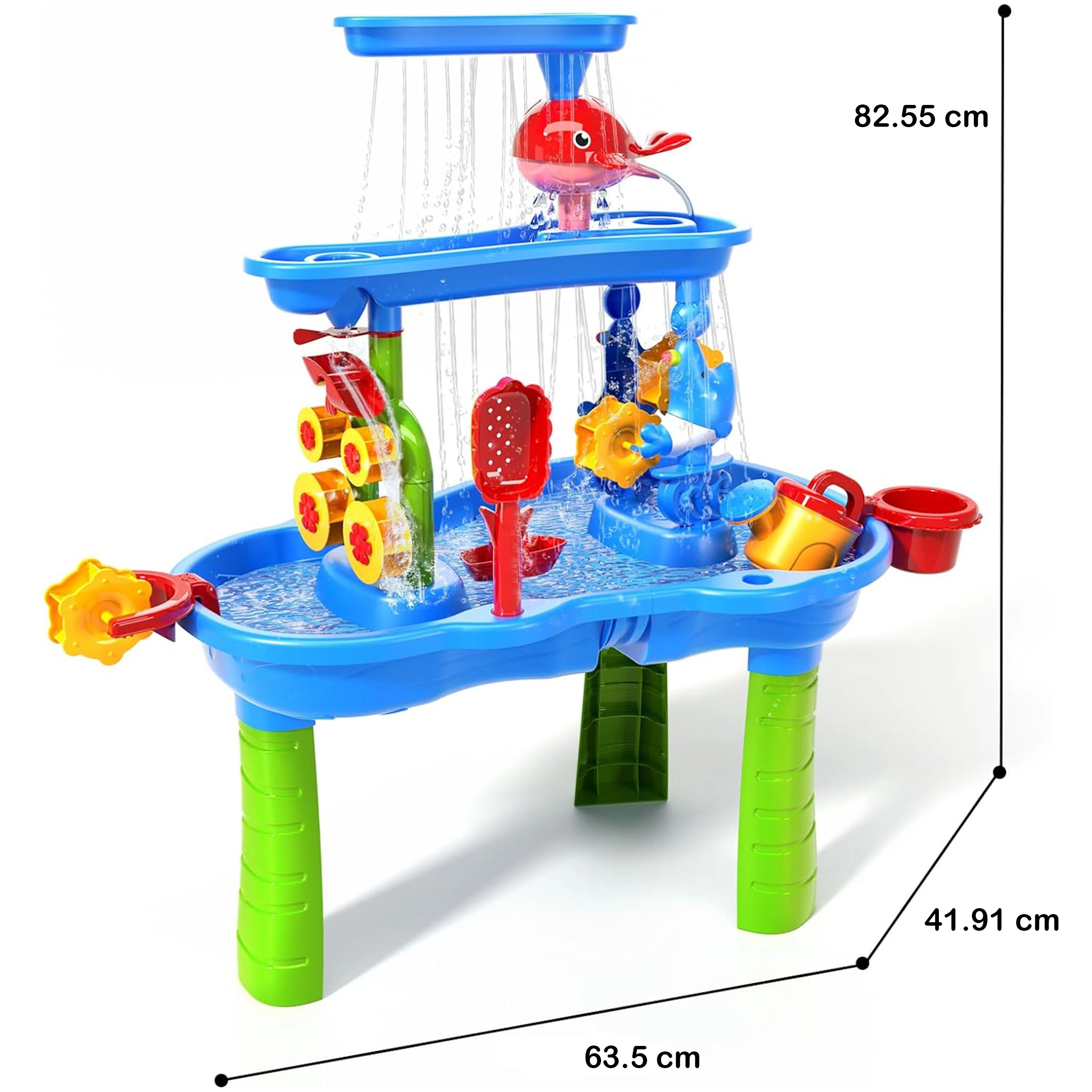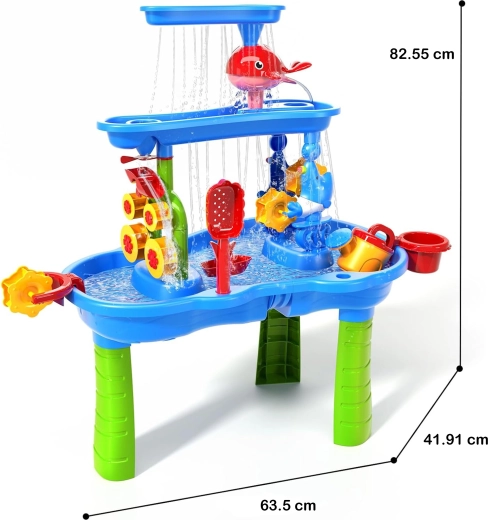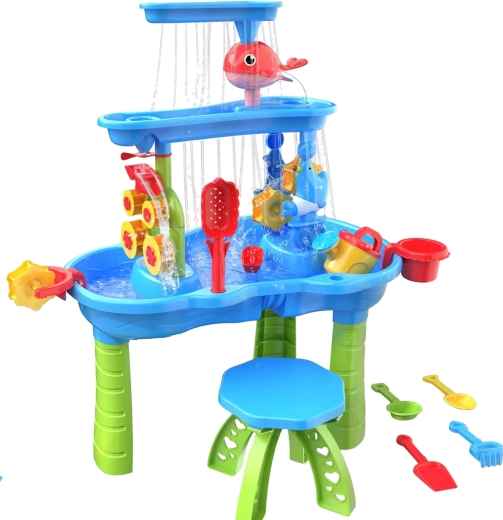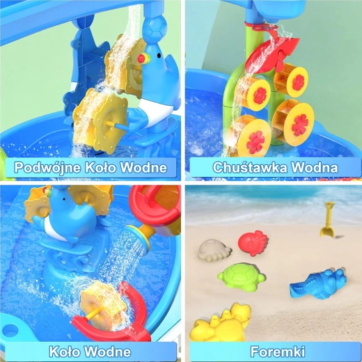 Vodní a pískový stolek WOOPIE XL přináší dětem celoroční zábavu – v létě chladivé vodní atrakce, v chladnějším období tvoření s pískem či kinetickým pískem. Díky 3patrovému kaskádovému systému děti nalévají vodu do horní nádrže a sledují, jak proud roztáčí vodní kola a mlýnky a teče do spodních vaniček. Součástí je i stolička a široká sada nástrojů pro hru a experimenty.
