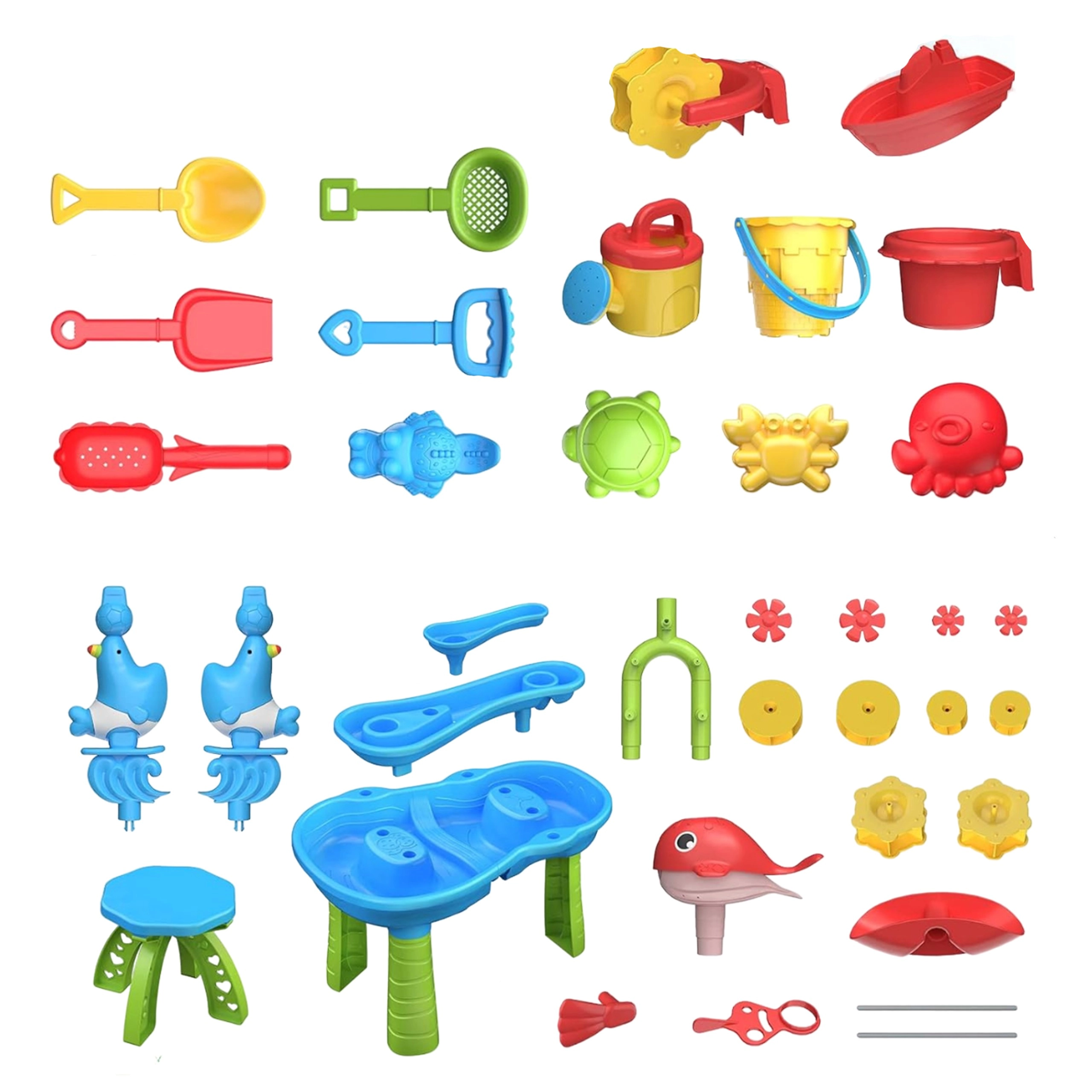- 2 vědra, konvička, 5 formiček, vodní mlýnek, 5 pískových nástrojů (lopatka, hrábě, sítko aj.), stolek, montážní příslušenství, stolička