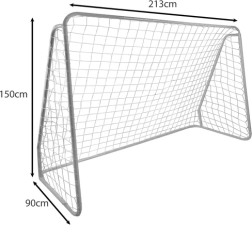 Rozměry 213 x 150 x 90 cm a oka velikosti 10 x 10 cm umožňují snadné použití s většinou standardních fotbalových branek.