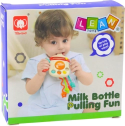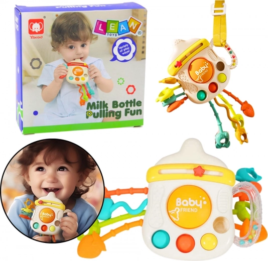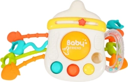Zábavná a bezpečná sensorická hračka 3v1 ve tvaru lahvičky podporuje rozvoj smyslů a jemné motoriky už od 6 měsíců. Nabízí kousátka, chrastítko, pop-it tlačítka a barevné šňůrky k tahání, které stimulují zrak, sluch i hmat. Díky pásku na připnutí je ideální do kočárku, autosedačky či postýlky. Vyrobeno z bezpečných materiálů bez BPA – skvělé i jako dárek.
