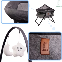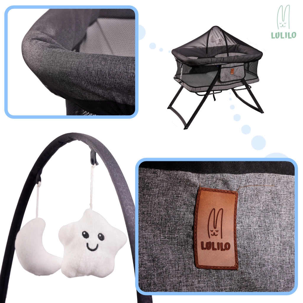 Praktická cestovní postýlka a kolébka 2v1 Lulilo Vojago poskytne miminku pohodlný a klidný spánek doma i na cestách. Díky rychlé změně na kolébku, nastavitelnému sklonu matrace, odnímatelnému potahu na zip a vzdušným síťovaným bokům zajistí bezpečí a pohodlí. Součástí je oblouk s hračkami, moskytiéra a praktická kapsa na drobnosti.