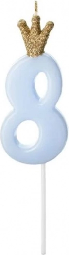 Tato modrá svíčka s číslem 8 a korunkou je ideálním doplňkem pro každou dětskou narozeninovou oslavu. Je navržena tak, aby přidala špetku elegance a radosti na každý narozeninový dort.