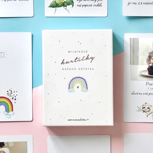 - 12 měsíčních kartiček (1.–11. měsíc + 1. narozeniny), 15 kartiček pokroků a zážitků, 5 univerzálních kartiček