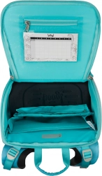 Penál se dvěma chlopněmi a kvalitním zipem, vybaven kapsičkami pro drobnosti a okénkem na rozvrh hodin.