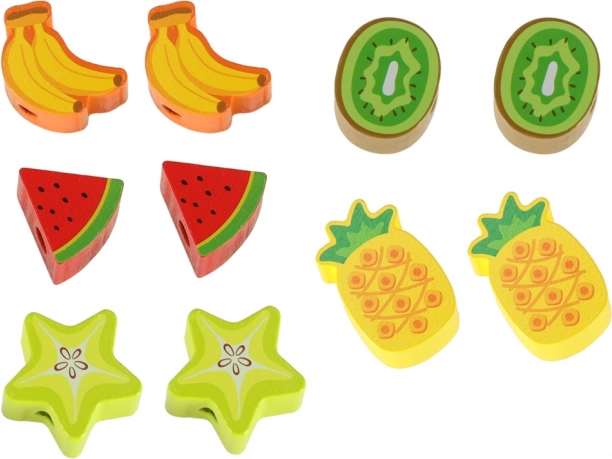 - 12 dřevěných ovoce + kostka + ježek + šňůrka