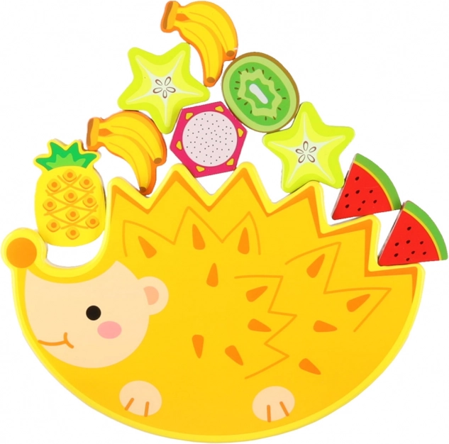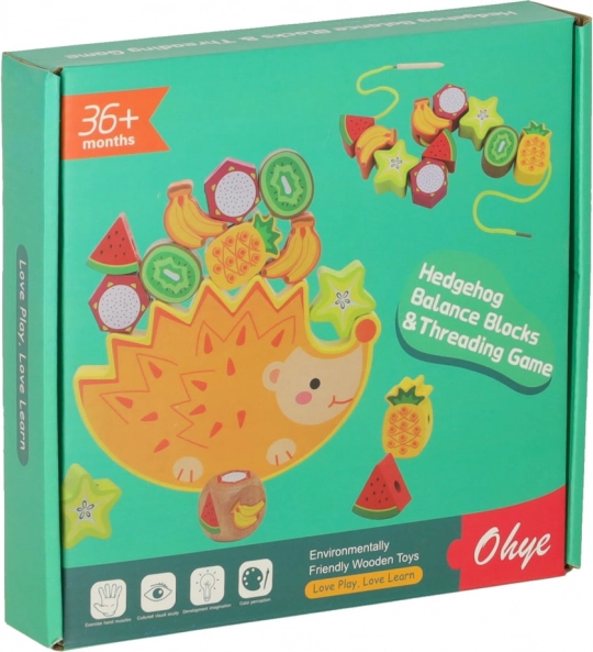 Roztomilý dřevěný ježek s barevnými ovocnými kostičkami nabízí dvě hry v jedné: navlékání ovoce na šňůrku a balanční skládání na hřbet ježka. Podporuje jemnou motoriku, logické myšlení a koordinaci oko–ruka. Kvalitní hladce broušené dřevo a syté barvy lákají k dlouhé a smysluplné hře.