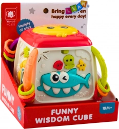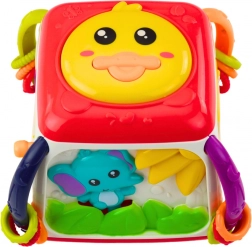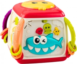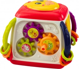 Kostka obsahuje interaktivní prvky jako jsou hudební tlačítka a otočná ozubená kola, které poskytují dítěti hodiny zábavy a stimulace.