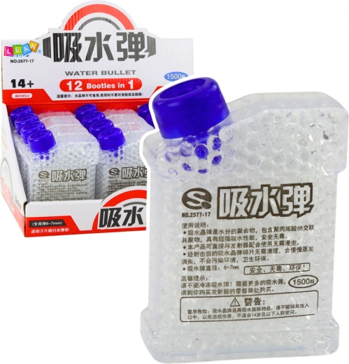 Průhledný zásobník ukrývá 1500 hotových hydrogelových kuliček o průměru 6–7 mm, které jsou připravené k okamžitému použití bez namáčení. Kuličky jsou bezpečné, netoxické a biologicky odbouratelné, po zásahu se rozpadnou a nezanechávají nepořádek. Vhodné pro většinu pistolí na vodní gelové kuličky, ideální pro domácí i venkovní zábavu.