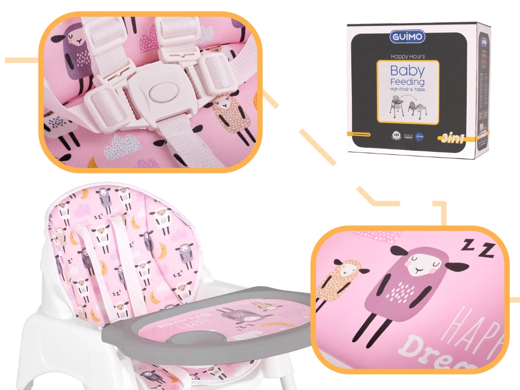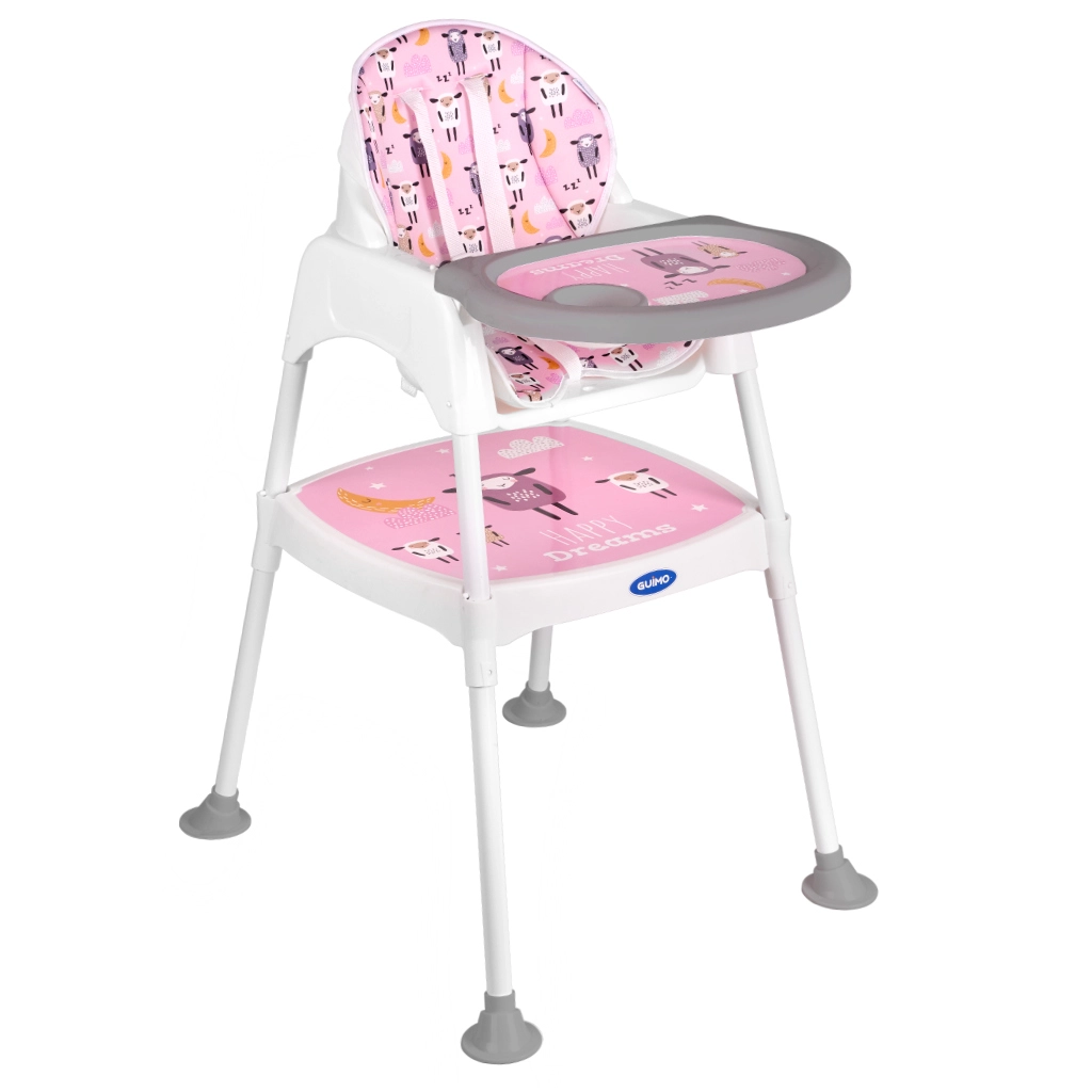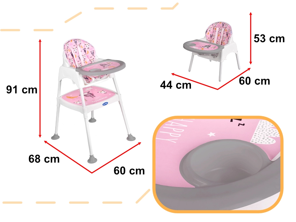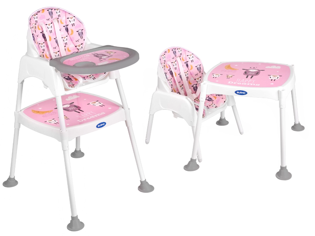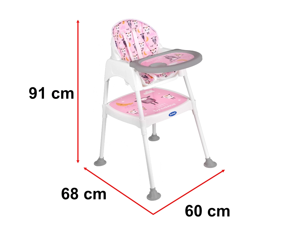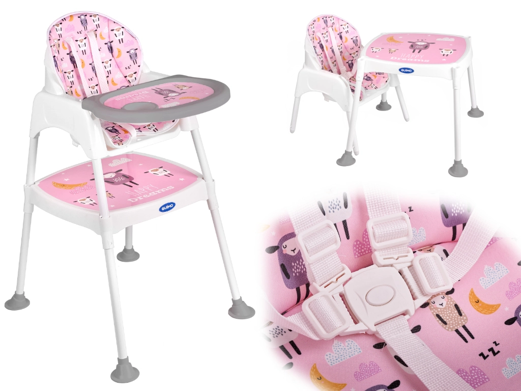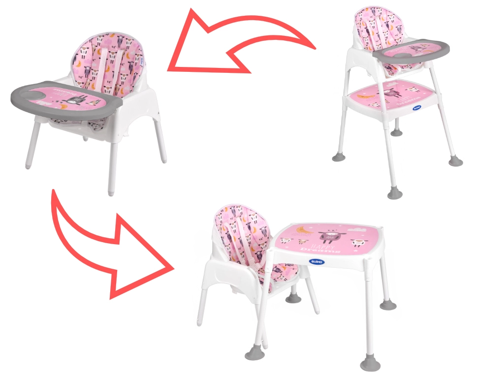 Praktická dětská jídelní židlička 3 v 1 s možností přeměny na samostatnou židličku a stolek roste s vaším dítětem od 6 měsíců do cca 6 let. Nabízí stabilní konstrukci, pětibodové pásy, snadno omyvatelné povrchy a měkké polstrování s možností praní. Ideální pro krmení, hraní i tvoření.