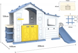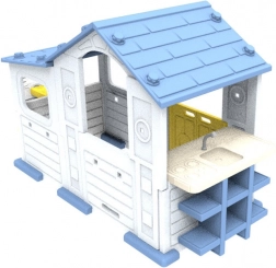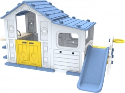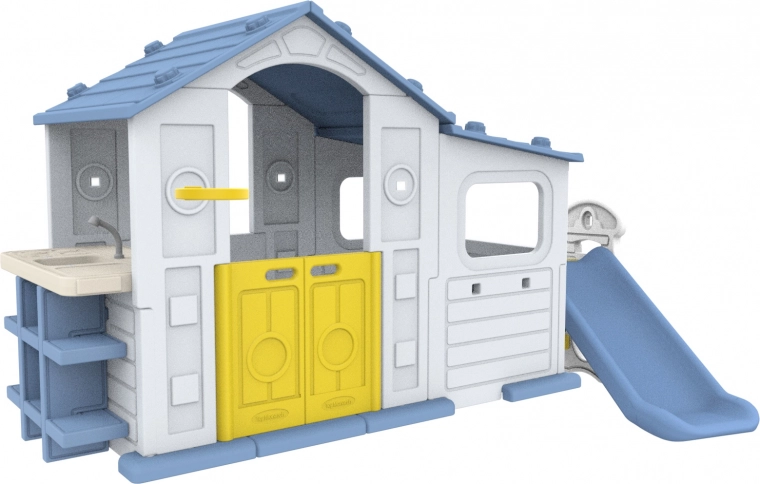Velký dětský domeček s předsíní, skluzavkou a dřezem s modrou střechou nabízí prostorné místo pro hru a bezpečnou dvouvrstvou skluzavku. Je vyroben z odolného HDPE s dvojitými stěnami pro vyšší stabilitu, má dřez s policemi, široké schody a koš na basket s míčem – ideální na zahradu i domů.