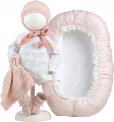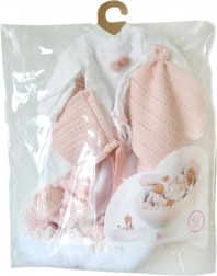 Obleček pro panenku miminko velikosti 40–42 cm je součástí 4dílného setu, který zahrnuje tři kusy oblečení, ozdobný muchlík a hnízdečko. Vyrobeno ručně ve Španělsku a určeno pro děti od 3 let.