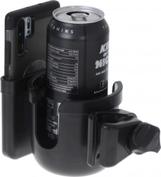 Tento držák je vhodný pro různé typy lahví, bidonů, termosů a telefonů. Čtyři pružné 'uši' zajišťují bezpečnou fixaci nápojů bez obav z vylití. Otevřené boky umožňují snadný přístup k obsahu. Přepážka na telefon umožňuje mít vaše zařízení stále na očích, takže nezmeškáte žádnou důležitou zprávu.