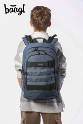 Školní batoh Skate Dust Blue: Lehký model s hmotností pod 900 g, nastavitelnými popruhy na skateboard a anatomicky tvarovanými zádovými výztužemi. Batoh je vybaven třemi samostatnými komorami, polstrovanou kapsou na notebook či tablet do velikosti 15 palců, reflexními prvky a spolehlivými zipy značky YKK.